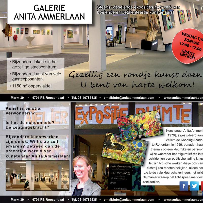 Professioneel kunstenaar Anita Ammerlaan geeft schilderworkshops in haar 1150m2 grote galerie in het centrum van het Brabantse Roosendaal. De workshops worden gegeven in een zeer inspirerende omgeving, in de galerie van Anita zijn doorlopend exposities te zien met het werk van professionele kunstenaars uit binnen- en buitenland. De workshops worden gedaan in kleine groepen zodat iedereen voldoende aandacht gegeven kan worden, minimaal 5 personen en maximaal 8 personen. Anita geeft workshops voor volwassen en kinderen,schilderervaring is persé niet nodig. Workshops voor besloten groepen zijn ook mogelijk, zoals bijvoorbeeld: familie, (kinder)feestje, vriendinnen, kinderen of bedrijven.