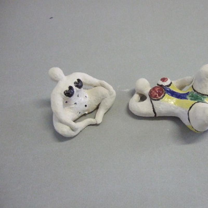 Een Nana gemaakt van klei waar later in de workshop met sinterengobes kleuraccenten op aangebracht kunnen worden. Als de beeldjes gedroogd zijn (na enkele weken) kunnen ze in de keramiekoven gebakken worden.