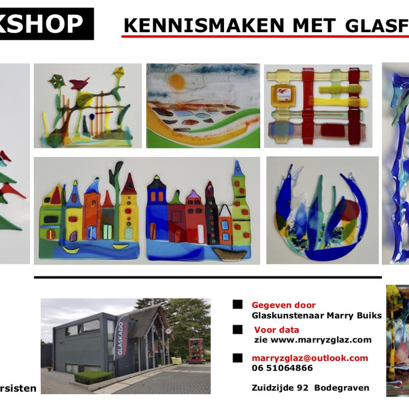 Op zoek naar een bijzondere activiteit? Dan moet u zeker kennis komen maken met de schitterende magische wereld van het versmelten van glas, ook wel glasfusen genoemd. In een inspirerende omgeving krijgt u, onder het genot van een kopje koffie/ thee, een korte uitleg over glasfusen, het glassnijden en kleurengebruik. Vervolgens leert u hoe u het glas moet snijden,breken en slijpen. Van gesneden en gebroken losse stukjes maakt u met eigen creativiteit, door de glasdelen naast en over elkaar te leggen, een uniek glasobject, wat aan maten gebonden is (A4-formaat).Onder een temperatuur ± 825 °C wordt het glasobject tot een geheel gevormd.Dit duurt een paar dagen. Vervolgens blijft het afwachten wat het stookproces met het gemaakte glasobject gaat doen. Als het stookproces is afgerond dan wordt de oven geopend. Dit is altijd spannend want dan pas wordt duidelijk of het glas het gewenste resultaat heeft opgeleverd. Soms is dat niet het geval en ontstaat er b.v. door de spanning van het glas breuken in het object. Dat maakt dat het werken met glas uitdagend en geen vanzelfsprekend is.Wij laten u weten wanneer het kunstwerk opgehaald kan worden. Workshop duurt ca. 4 uur, incl. gemiddelde hoeveelheid glas; 1 x stoken in de glasoven; koffie/ thee; afhankelijk van tijdstip incl. lunch of frisdrank/ wijn en borrelhapjes.