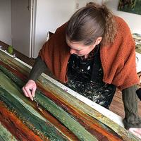 Je gaat eerst wat ‘voorwerk’ doen voordat je aan je paneel of doek begint. Je probeert verschillende composities uit, experimenteert met kleuren en je oefent met alle effecten die je met het paletmes kunt verkrijgen. Deze onderdelen nemen het meeste tijd in beslag en het is belangrijk dat je jezelf de tijd geeft om alles uit te proberen en in de flow te komen. Daarna zul je het zien: de afwerking van je schilderij is peanuts! Je weet met welke kleuren je begint, welke technieken voor jou werken en wat voor compositie je ongeveer gaat maken. Je kunt steeds weer kijken of je nog iets aan de compositie verandert of nog druktechnieken toevoegt. Totdat je helemaal tevreden bent. Tenslotte kun je nog wat elementen uitwerken met pennen, markers en andere mixed-media materialen.