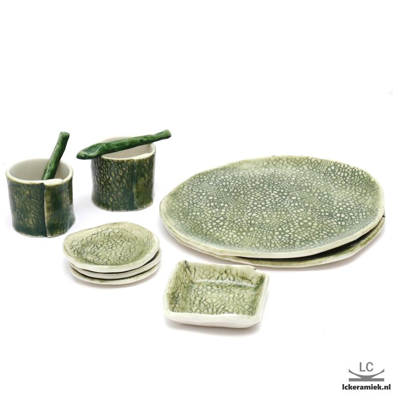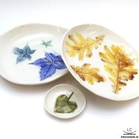Voor de decoratie maken we gebruik van textuur, zoals van kant of bladeren. In die textuur wrijven we kleur, waarna we deze afdekken met een glanzend laagje glazuur. Dit glazuur is wat we tijdens de tweede bijeenkomst aanbrengen. Na nog een laatste keer stoken op ruim 1200C is je porseleinen servies helemaal klaar voor gebruik, en zelfs vaatwasserbestendig!