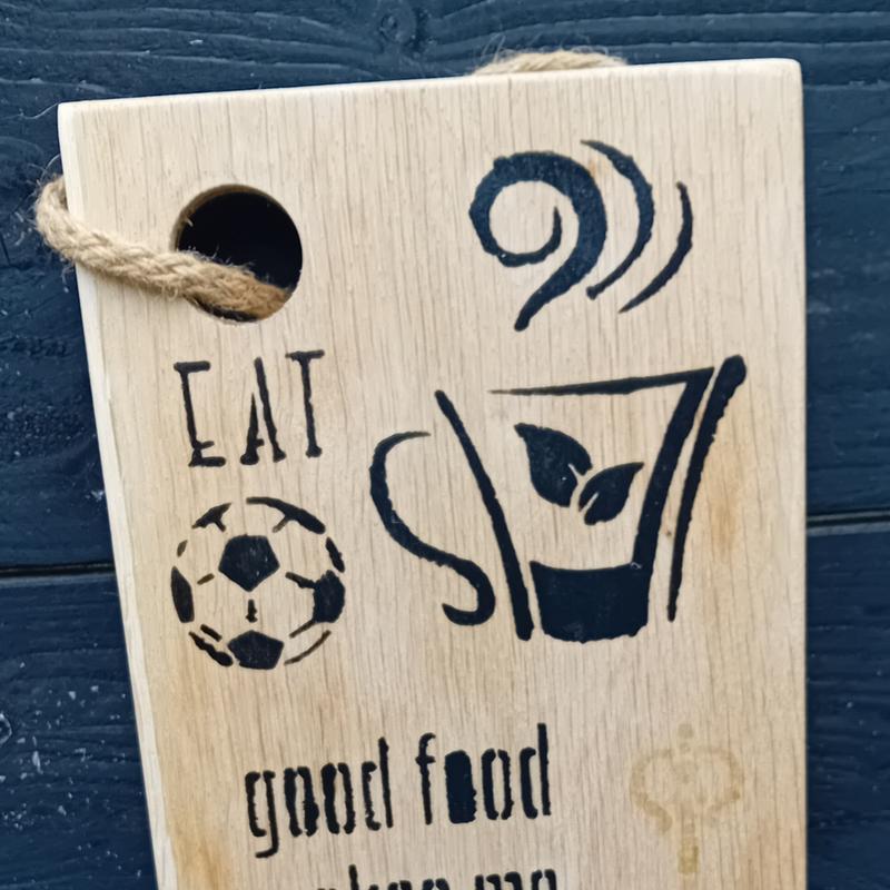Workshop hapjesplank / borrelplank eiken. De eiken hapjesplank is op maat gezaagd. +/- 40 cm lang x 20cm. We gaan hem eerst indien gewenst bijschuren en daarna voorzien van een leuke tekst, of afbeelding. Dit kan een tekst van een sjabloon zijn of je eigen tekst, die je erop verft. Als dit klaar is gaan we aflakken, een touwtje erdoor en klaar. Ondertussen kunt u koffie en thee met wat lekkers nuttigen. Duur +/-1,5 uur. Min 2 personen. Max 12 personen*. Neem contact met ons op om een datum te bespreken.
