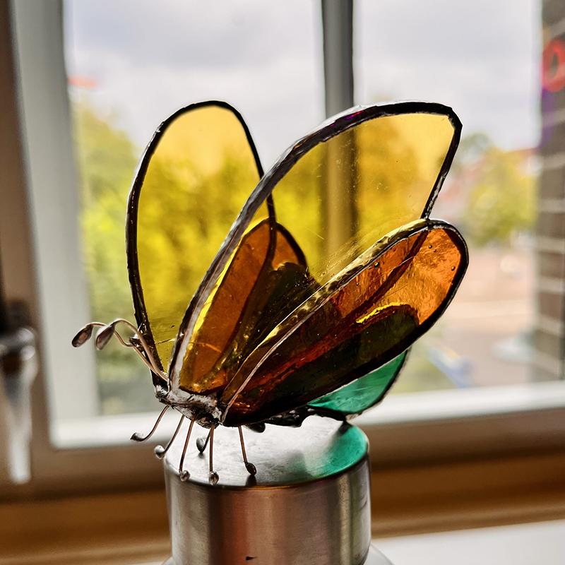 Het gesneden glas ga je met koperfolie bewerken. Hiervoor zijn verschillende maten koperfolie beschikbaar. We gaan het koperfolie solderen om de mooie tiffany lijnen te creeeren. Hiervoor gebruiken we soldeertin en een speciale Tiffany soldeerbout. Het Tiffany stuk kan voor afwerking nog gepatineerd worden in koperkleur of in zwart. Daarna is het poetsen…poetsen… poetsen! En je hebt een prachtig werkstuk om mee naar huis te nemen.
